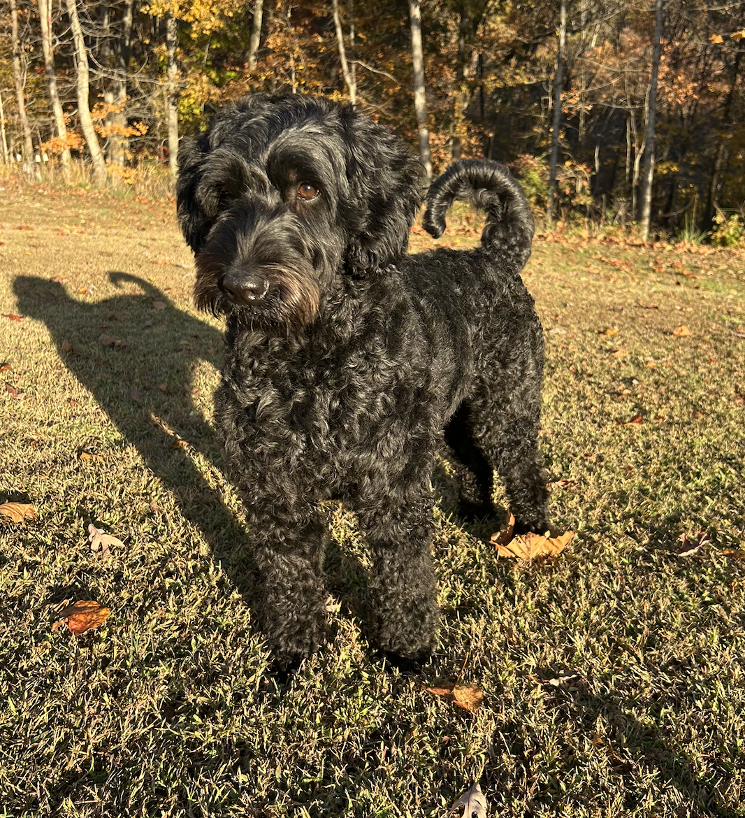 Lil’ Oakley is complete sweetness. She is a smaller standard around 40lbs with a wavy fleece coat. She is affectionate, loves to cuddle and longs to play. She loves people and is always wagging her tail with any type of attention. She is very loyal and smart. She wants to be everyone’s best friend. Lil’ Oakley is retired, however be on the look out for some of her upcoming breeding dogs.