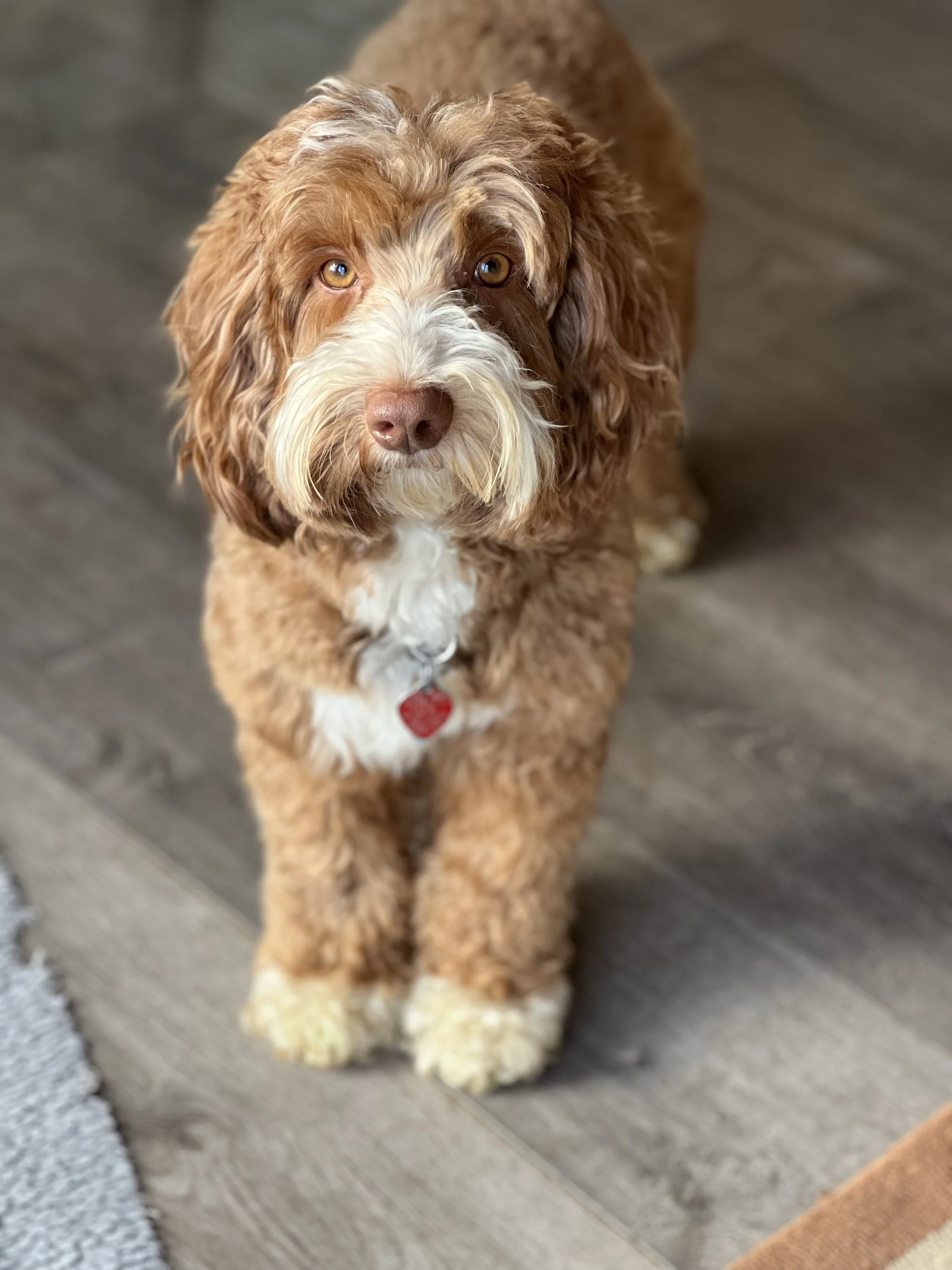 Pete is so sweet! He is a mini at 22 pounds. He has a super soft, silky and wavy fleece coat with remarkable white markings on his deep red coat. He loves to cuddle. He also loves to go to Lake Erie with Annie and walk the lake beaches. Bentley and Pete are two peas in a pod. Thank you Aussie Labradoodle for this great additional to our breeding family.